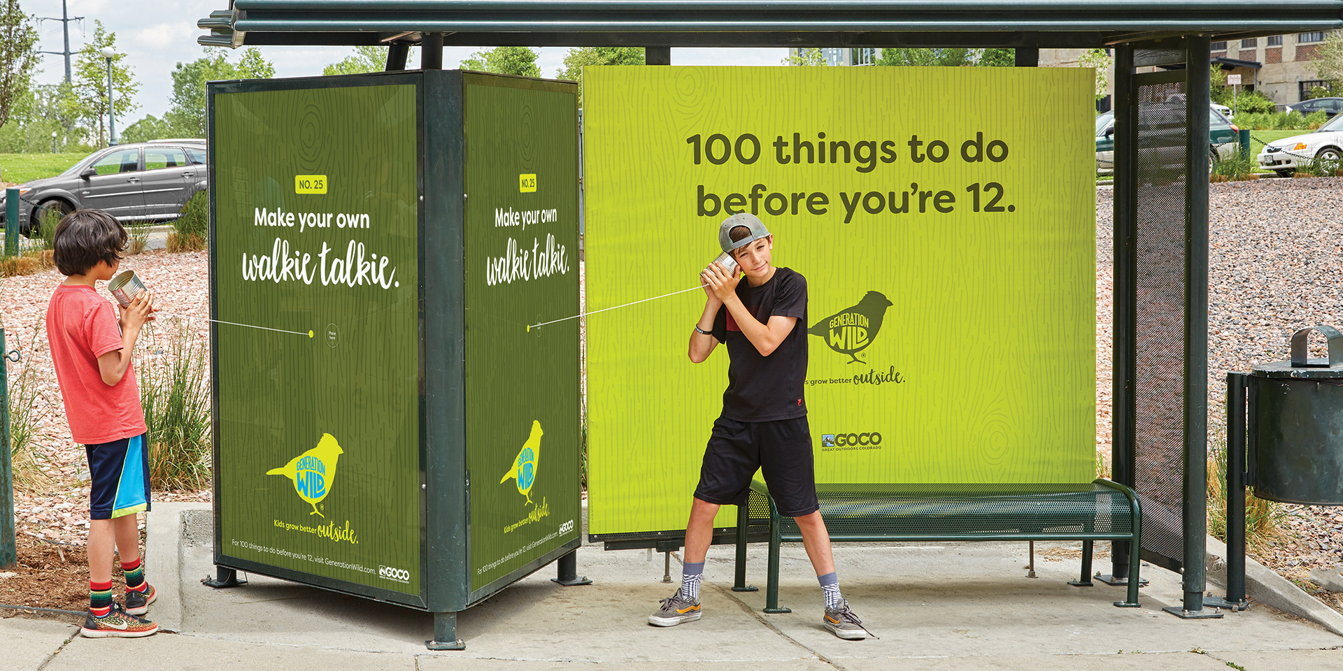 Gen Alpha plays outside less than any other generation. Great Outdoors Colorado, a state-funded organization that builds public parks and trails, wanted to change that. So we created Generation Wild, a brand designed to convince kids to trade their phones and tablets for sticks and stinkbugs. We launched it with a bucket list of 100 things to do before you're 12.